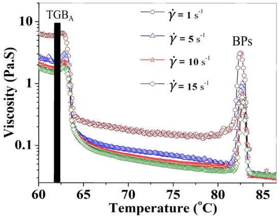 Recently, Rasmita et al. studied the rheological properties of a TGBA phase with a wide temperature-range [25]. It was discovered in a binary mixture of two compounds, namely 4-(2-methyl butyl phenyl)4-n-octylbiphenyl-4-carboxylate (CE8 ) and 2-cyano-4-heptyl-phenyl-4- pentyl-4-biphenyl carboxylate (7(CN)5), where CE8 is a chiral and 7(CN)5 is a nonchiral compound, by Pramod et al. [10,11]. Sixty-three-point-six weight percent of CE8 and 36.4 wt % of 7(CN)5 in the mixture are known to show the following phase transitions: I 123 C N* 83.5 C TGBA 60.2 C SmC *. Thus, the temperature range of the TGBA phase is about 20 C. The phase transitions were identified from the temperature-dependent shear viscosity measurements (Figure 6). The shear viscosity of the TGBA phase is two orders of magnitude larger than that of the cholesteric phase.