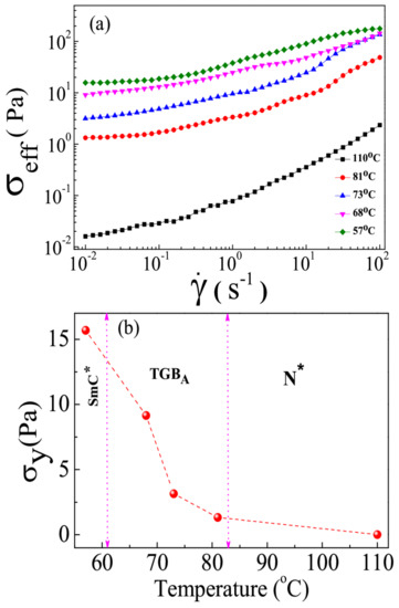 Figure 7a shows the shear rate-dependent shear stress of different phases of the mixture. At a low shear rate, where , the shear stress tends to reach a constant value showing an apparent yield stress (). Figure 7b shows the variation of yield stress at different phases. In the N* phase, is negligibly small ( Pa). In the TGBA phase, ≃ 10 Pa. Thus, the yield stress of TGBA is three orders of magnitude larger than that of the N* phase. However, the apparent yield stress of the TGBA phase of the studied mixture is much larger than that known for low molecular weight smectic liquid crystals [28,29].
