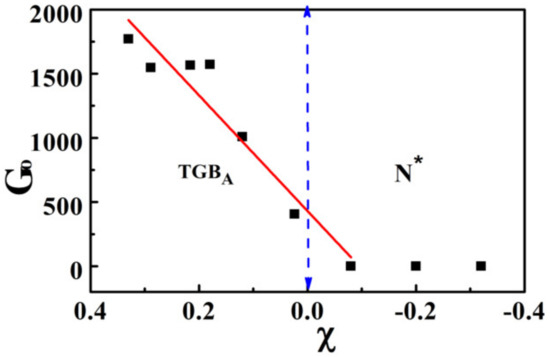 The temperature variation of is directly related to the defects. The variation of with reduced temperature (TN*-TGBA − T)/(TN*-TGBA) is shown in Figure 10. In the TGBA phase, is more than three orders of magnitude larger than the N* phase (Figure 10). In connection to the rubber elasticity, the elastic response of static defect network varies as ≈ , where is the line tension and d is a typical average spacing between defects [38]. The defect line tension can be expressed as , where B is the layer compression modulus, b = is the Burger vector of integer strength m and is the defect core radius [40]. There are many smectic liquid crystals in which [41] and , where is the smectic order parameter [42]. Hence, the defect line tension () varies as ∼ . This implies that the elasticity of the static defect network varies as with ≈ 0.9 [42]. Figure 10 shows the variation of with the least square fit parameter . Assuming a medium value of Berger’s vector of integer strength m = 2 [43], B ≈ 2 × Pa [30,41] and using the relation , the calculated inter-defect spacing in the TGBA phase is 26 nm. This calculated value is closely comparable with the experimentally-measured dislocation spacing in the TGBA phase [7].