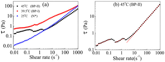 The flow behaviors of the BP-II, BP-I and N* phases are shown in Figure 14. The N* phase exhibits a typical shear thinning behavior. The yield stresses of BP-II and BP-I are about one order of magnitude larger as compared to the N* phase. BP-I and BP-II both exhibits multiple shear thinning behavior at a higher shear rate range. The shear stress of BP-II shows three distinct regimes, i.e., BP-II(1): = 0.01–0.3 s; BP-II(2): = 0.3–2 s and BP-II(3): = 2–1000 s. Figure 14b shows a power-law fit; = a, which describes the data to a very good approximation. The fit parameters are: a = 0.87 and = 0.33 in BP-II(1); a = 0.42 and = 0.35 in BP-II(2); a = 0.12 and = 0.87 in BP-II(3).
