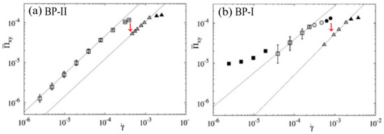 Recently, Henrich et al. studied the rheology of cubic blue phases by computer simulation [20,21,23]. They have identified various flow regimes with increasing shear rate in both BP-I and BP-II. The typical flow curve in both phases is shown in Figure 16. Experimental results of Figure 14 qualitatively agree with the predictions of the simulation except that shear rate ranges are different.