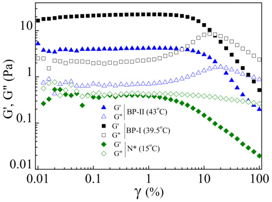 The deformation behavior of blue phases is further studied by the amplitude sweep. The results of amplitude sweep, i.e., the strain-dependent storage () and the loss () moduli at different temperatures representing different phases (BP-II, BP-I and N*), are shown in Figure 17. The N* phase shows a typical fluid-like behavior. The shear moduli of both the blue phases (BP-II and BP-I) are higher than that of the N* phase. The storage modulus () of BP-I is about five-times larger than that of BP-II. The Linear Visco-Elastic (LVE) ranges of both BP-II and BP-I are almost equal, i.e., = 4%. The strain-induced fluidization (the crossover of and ), or the critical strain amplitude denoted by , is 16% in the case of BP-I. However, in BP-II, it occurs at a slightly higher strain value ( = 20%) than that of BP-I. It was interpreted that in BP-II, the defect lines intersect with each other, which needs a larger strain amplitude to break.