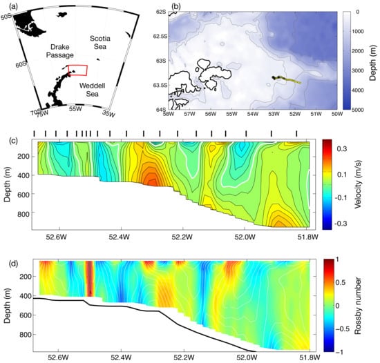 (a) Overview map of the Weddell Sea sector of the Southern Ocean. (b) An enhanced view of the red box in panel (a), where bathymetry (m) is given in color. Circles in panel (b) correspond to a single hydrographic transect collected by an ocean glider in January 2012. (c) Vertical, cross-slope section of cross-transect (along-slope) velocity, v; the zero contour is given in white. (d) Rossby number approximated by , where x is the cross-slope direction of the same transect in panel (c). Tick marks at the top of panel (c) indicate the surfacing positions of each glider dive. See Thompson et al. [23] for further details.