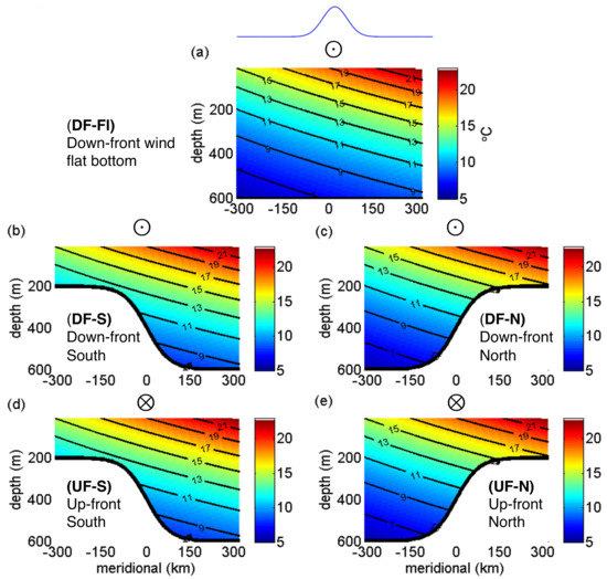 Schematic overview of the model configuration for the five simulations described in Table 1. Panels (a–e) correspond to experiments (1)–(5). Experiment ID is indicated in each panel. Colors and contours show the zonally-uniform initial temperature profile. The temperature is relaxed to these initial values at the northern and southern boundaries. The thick black curve marks the bathymetry, while the circle over each panel marks the wind orientation: down-front (dots) or up-front (crosses). The blue curve on the top of panel (a) shows the surface wind stress profile, with a peak value N m−2.