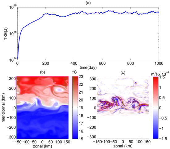(a) Growth of total kinetic energy in Experiment DF-S. (b) Snapshots at day 900 for Experiment DF-S (Table 1) surface potential temperature (°C) at 10 m depth. (c) Same as (b), for vertical velocity w ( m s−1) at 30 m depth.