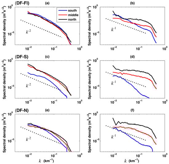 Spectra of surface horizontal kinetic energy (10 m depth, left panels) and vertical velocity (30 m depth, right panels) averaged from day 800 to 1000. (a) Kinetic energy spectra and (b) vertical velocity spectra in Experiment DF-Fl. (c) Kinetic energy spectra and (d) vertical velocity spectra in Experiment DF-S. (e) Kinetic energy spectra and (f) vertical velocity spectra in Experiment DF-N. Dotted lines represent and spectral slope, provided for reference. Blue lines represent the southern flank of the domain from −300 km −100 km. Red lines represent the middle of the domain (frontal region) from −100 km 100 km. Black lines represent the northern flank of the domain from 100 km 300 km. Spectra in Experiments UF-S and UF-N are similar to those in the control Experiment DF-Fl, and are not shown in this figure.