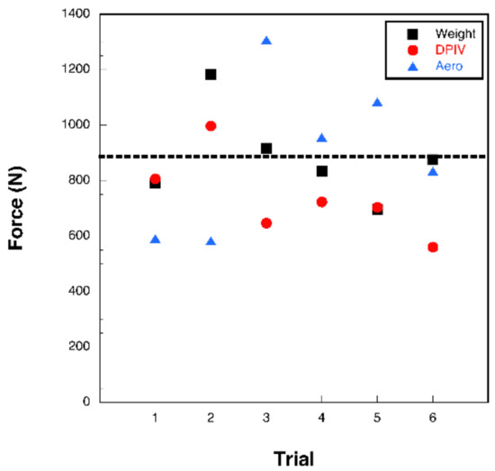 Comparison of the methods of bubble DPIV and aerodynamic analysis for each experimental trial. Symbols represent the weight supported out of the water during a tail stand (black squares), thrust measured using bubble DPIV (red circles), and thrust measured using aerodynamic analysis (blue triangles). The dashed line is the mean weight supported during a tail stand for the six experimental trials.
