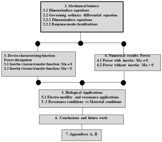To avoid repetition of lengthy derivations the reader is referred to [10,12]. In [10] we describe the fluid viscoelasticity with a Maxwell fluid model, neglect momentum inertia (zero Deborah number: De = 0), and formulate the model in the time domain. In [12] we extend the previous Maxwell model with the inertial mechanisms (Deborah number: De ≠ 0) and using the Fourier formalism two power resonance power peaks were found [12] (see Appendices of ref. [12]). These two early works do not show a minimum in the power spectrum [10,12], such as other mathematical approaches [15]. In this research, we model the system in the frequency domain, including momentum inertia, and develop a generic approach that can be used in the future with any linear and fractional viscoelastic constitutive equation, as required by experimental results [15]. The new approach is novel and significant because we extend the power spectrum with a well localized maximum and minimum, i.e., a non-monotonically behavior found in biological systems such as outer hair cell [15] (see Figure 7 of ref. [15]). This paper is organized as shown in Figure 1. Section 2 introduces the generic features of the dimensionless governing electro-rheological model of the electric field responsive membrane embedded in Jeffrey’s viscoelastic fluids. Dimensionless numbers and characteristic modes. The governing equation is based on the integration of: (i) the flexoelectric membrane shape equation applied to a circular membrane attached to the inner surface of a circular capillary; and (ii) the capillary flow of the contacting viscoelastic phases. Section 3 presents the characteristic spectrum of the power output as a function of the Mach number and dimensionless numbers associated to the flexo-electric, viscoelastic and elastic mechanisms of the system. Section 4 presents selected representative numerical results of the device (small and zero Mach numerical values). Section 5 deals with the discussion of the numerical predictions, Biological applications, dominat mechanisms, and resonance conditions, respectively. The conclusions and future work are discussed in the last part of this research (Section 6). Appendix A and Appendix B show scaling, dimensionless numbers, and some mathematical derivations of the power dissipation for the 3OD (third-order ordinary differential equation) model.