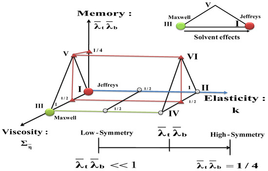Prismatic material space for the six possible modes of Equation (16), shown in Table 1. The vertical axis is the memory, the horizontal is the elasticity ratio k, and the axis out of the page plane is the total viscosity. The six vertices correspond to the six modes in Table 2. Below the prism, the horizontal arrow shows the range of the dimensional numbers: (i) memory , (ii) Maxwell relaxation numbers , (iii) total bulk viscosity , (iv) Bulk retardation viscosity , and (v) bulk weighted retardation viscosity . The triangle in the upper right corner describes the material line that contains the modes corresponding to a small elasticity ratio where the power dissipation is different form zero. The line I–III shows the material conditions where the model displays a monotonical behavior (mode III) and non-monotonical solvent behavior (mode I).