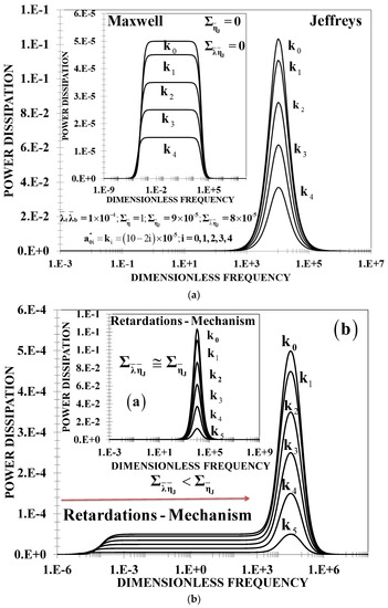 In this section, the power spectrum in the case of a small Mach number, i.e., when the inertia mechanisms are smaller in comparison with viscoelastic forces is shown. In this case, the starting point of the numerical results come from Equations (16), (20), and (21). The numerical values correspond to the first and third modes of Table 2. In Figure 5, the effect of the power dissipation vs. the dimensionless frequency as a function of the retardation mechanism through the dimensionless numbers for four particular cases corresponding to the modes {I, III} of Table 2, is shown. The mathematical and physical power predictions of the Maxwell and Jeffrey’s constitutive equations are summarized in Table 3.