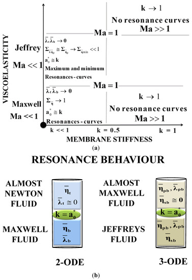It was demonstrated for a Maxwell fluid [10,12], that the important resonant characteristics are dominated by four dimensionless numbers . In the extended Jeffrey’s model (Equations (11)–(13)) additional numbers are obtained by including inertial and solvent mechanisms which can be interpreted as small perturbations to the previous Maxwell model [10,12]. According to the magnitudes of the main dimensionless numbers , six case scenarios are possible i.e., the memory symmetry can be high (HS) or low (LS), the total viscosity high (HV), medium (MV), or low (LV), and the membrane can be floppy (FM) or stiff (SM), and these are summarized in Table 2 [10,12]. The third and fourth columns are the contributions of the Jeffrey’s retardation mechanisms , which are zero for the Maxwell model. For example, the first row {LS, LV, FM} corresponds to low symmetry, low viscosity, and floppy membrane [10,12]. This effective mode classification narrows the parametric envelope of biological significance. The specific numerical values in Table 2 are selected to be characteristic of each mode; the last two columns are bulk retardation and weighted retardation viscosity, respectively, which will be defined in the next section.