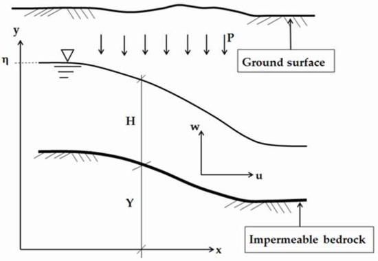 26] investigated the applicability of this equation to oscillatory plane flow in coastal aquifers of intermediate depths. For the case of unconfined groundwater flows with negligible vertical curvature of the streamline over sloping planar bedrock, Equation (11) degenerates to a Boussinesq-type equation, structurally analogous to Childs’ [