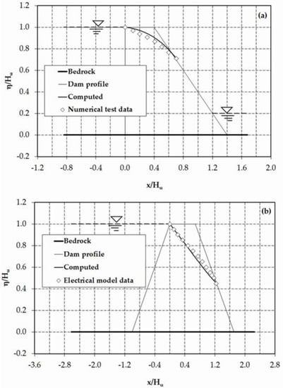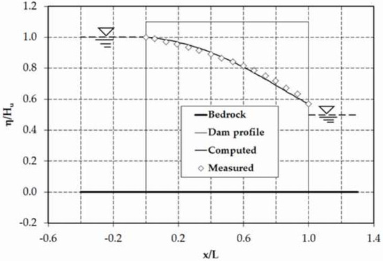 37] (p. 323), resulting in satisfactory agreement. The results for both test cases, i.e., rectangular and trapezoidal dams, revealed that the present model is capable of predicting the existence of a seepage surface on the downstream face of the dam. Nonetheless, the presence of such a surface is not recognised by the DF model [
