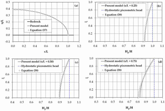 Figure 11b–d, the predicted piezometric head profiles showed a good correlation with Engelund’s solutions. Nonetheless, a minor discrepancy between the numerical and analytical results can be seen from this figure near the impermeable bedrock. The differences in the piezometric head values did not exceed 2% (absolute percentage value) of the flow depth at the section. In general, the trend of the piezometric head profile was satisfactorily simulated by the proposed model. Unfortunately, the conventional DF theory, which is based on an equivalent approximation of hydrostatic pressure [