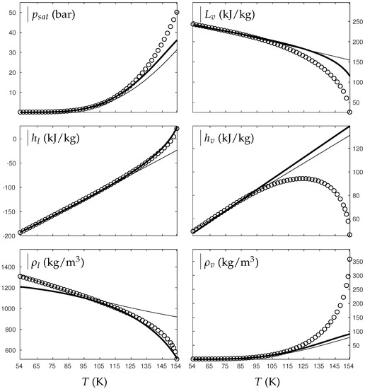 Comparison between experimental and theoretical saturation curves for liquid and vapor oxygen. Symbols represent experimental data. The thick lines represent the theoretical saturation curves obtained with the liquid Extended NASG EOS (ENASG) Equation (56) and its “alternative” but conditionally convex formulation for the vapor phase, Equation (A38). denotes the saturation pressure, the latent heat, h the specific enthalpy and the density.