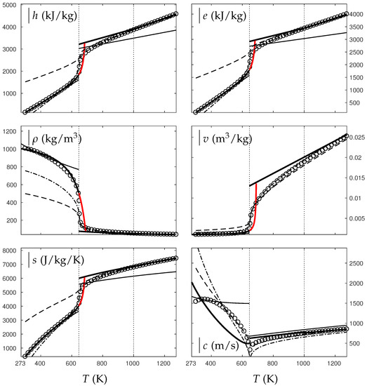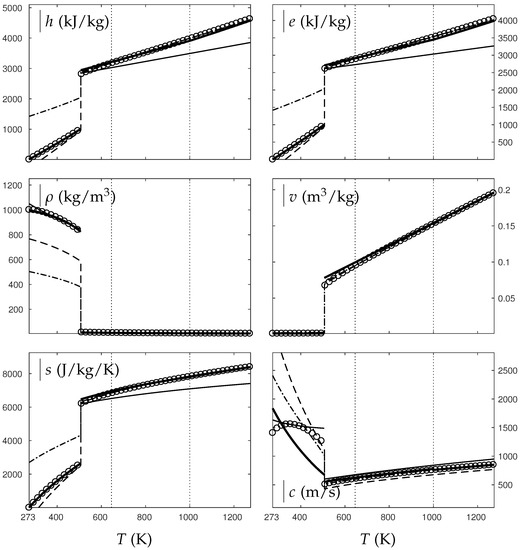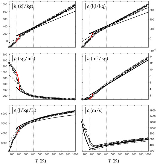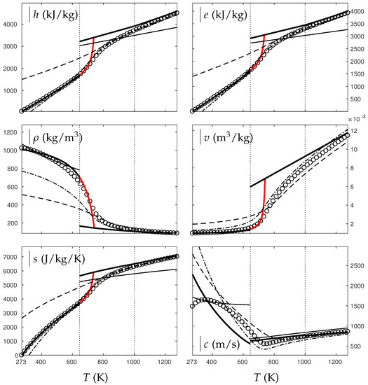 The last coefficient is finally determined with the least squares method, corresponding to the ideal gas reduction of Equation (A31). The isobar bar is used one more time with points for water corresponding to the temperature range [372.76 K–1275 K] and points, [90.062 K–1000 K] for oxygen.
