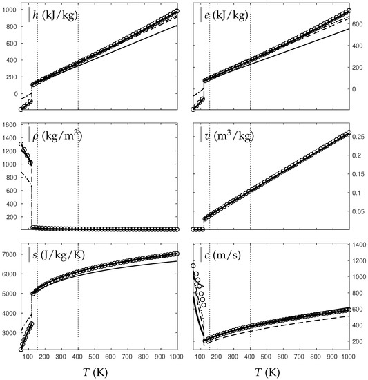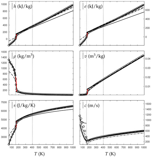 and can be solved with an iterative method. and are then determined via Equation (A22), and the reference internal energy is computed with Equation (A25). The reference entropy is the only unknown value at this point. The least squares method is used one more time with Equation (38). Searching the optimum coefficient, the following relation appears after some algebraic manipulations,