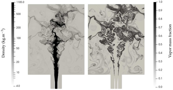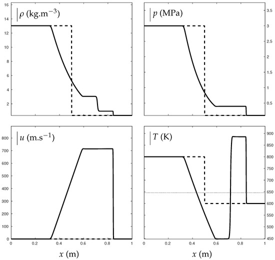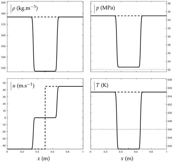 - The first and certainly the most obvious and limiting is related to its inability to deal with liquid and non-condensable gas separated by well-defined interfaces, such as for example interfacial flows of liquid water and air. The thermodynamics of these two media being considered as discontinuous, specific theoretical and numerical treatments have been addressed. In this context, Arbitrary Lagrangian Eulerian (Hirt et al. [2]), Interface Reconstruction (Youngs [3]), Front Tracking (Glimm et al. [4]), Level-Set (Fedkiw et al. [5]), anti-diffusion (Kokh and Lagoutiere [6]) methods are possible options. Another approach relies on continuous models with extra internal variables, such as volume and mass fractions and extended equation of state. Examples of such models are the Kapila et al. [7] one and its extension with phase transition (Saurel et al. [8]) to cite a few. With these formulations, the same equations are solved everywhere routinely, in pure liquid, pure gas and interface which becomes a diffuse zone. These models are indeed often named “diffuse interface methods” (Saurel and Pantano [9]). In this approach, hyperbolic models with relaxation are considered and each phase evolves in its own volume, with its own thermodynamics. In particular, there is no need to address cubic formulations. When phase transition is addressed, it occurs through mass transfer terms that can be considered finite rate (Saurel et al. [8], Furfaro and Saurel [10]) or assumed stiff when the physical knowledge of the phase change kinetics is not enough documented (Le Métayer et al. [11], Chiapolino et al. [12,13]) or unnecessary.