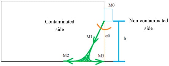 Figure 2 presents a cross section of the plane jet system. The flow rate balance is presented in Equation (1), where , , and are the jet flow rate at the floor impingement zone, the flow rate rejected to the contaminated side, and the flow rate rejected to the non-contaminated side, respectively.