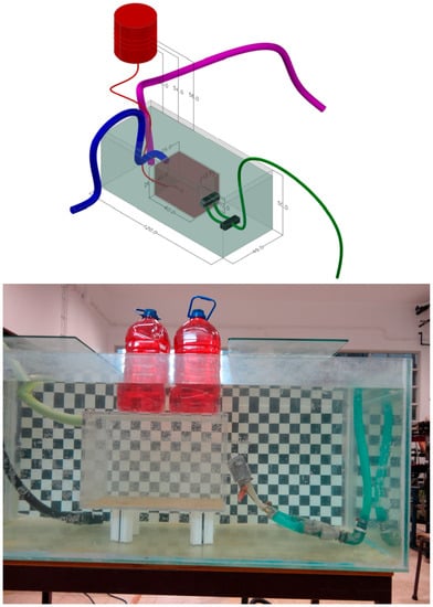In this research, tests were carried out on a small-scale model (1/20) installed in a water tank, with a view to simulate the full-size prototype (air curtain). Water was adopted as the testing fluid in order to maintain, in the model, the same range of Reynolds number as in the prototype. The definition of the Reynolds number currently used for plane jets, , was considered [33]. Although axisymmetric jets remain laminar up to Re = 1000 and became fully turbulent for Re > 3000, the plane jets from a long and narrow slot may present appreciable turbulent instabilities beyond Re as low as 30 [33]. Therefore, these small-scale tests, with Re ranging from 147 to 2125, will be carried out in the transition regimen. The results may not be easily extrapolated for full size air curtains unless complementary work will be done. For this reason, this research project encompasses further phases of full-scale CFD simulation of air curtains and final full-scale testing. The model was placed in a tank measuring 1.20 m × 0.49 m × 0.50 m, and the model compartment had the following dimensions 0.40 m × 0.25 m × 0.26 m, and comprised an opening that simulated the door with the dimensions of 0.125 m × 0.125 m. The jet was located at the soffit of the opening and had a width of 0.1456 m and thicknesses of 1.25 mm, 2.50 mm, 3.75 mm, and 5.00 mm, respectively. The jet was connected to a pump with a flowmeter that was used to measure the flow in the jet nozzle. In the compartment, on the opposite end of the door, there were two openings, one for the contaminant supply (fed by gravity and consisting of water with coloring), with a diameter of 0.01 m, and another for the exhaust flow (with a pump), with a diameter of 0.05 m. The contaminant level was kept constant so as to ensure that its flow rate also remained constant (Figure 3). In the photo of Figure 3, the red bottles were used to avoid the floating of the model. The model is upside down because, when used for studying non-isothermal flows, it is less expensive to simulate the hot fluid with saltwater, which is denser [4]. This position does not influence the isothermal results.