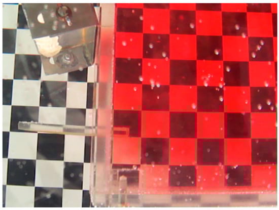 During the tests, the contaminant transport through the door was assessed by naked eye observation. Reference must be made of the fact that the human eye is not an optimal instrument, and, as such, it was necessary to establish a criterion to determine whether the exhaust flow was in a minimum limit state, so that no contaminant was leaking through the curtain. Therefore, the following cases were considered (Figure 4, Figure 5 and Figure 6 present a detail of the test setup where is possible to see just the cross section of the plane jet and of the opening; these pictures were rotated in order so that the jet is presented in a downward position; the inside water is coloured by the turbulent mixture with the jet coloured water): oversized exhaust flow rate (Figure 4), limit state condition (Figure 5), and insufficient exhaust flow rate (Figure 6). In the first case, a triangle of discoloration in the water was observed in the compartment, which showed that the inflow at the door was too high; in the third case, some eddies were observed, which were leaking through the door (meaning that the hydrodynamic sealing of the curtain was lost); in the second case, the previously mentioned structures were not observed, which corresponded to the optimized hydrodynamic sealing conditions.