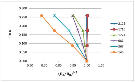 The second parameter analyzed was the influence of the jet angle. For the purpose of this study, the ratio between the average velocity at the opening and the nozzle velocity was compared with sin α. The lines connecting the experimental results for the same Reynolds number are almost linear, if is used as a coordinate. Figure 8 shows that there is no influence of the jet angle for the Reynolds numbers close to Re = 1710 or above this value.