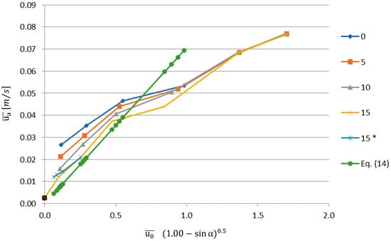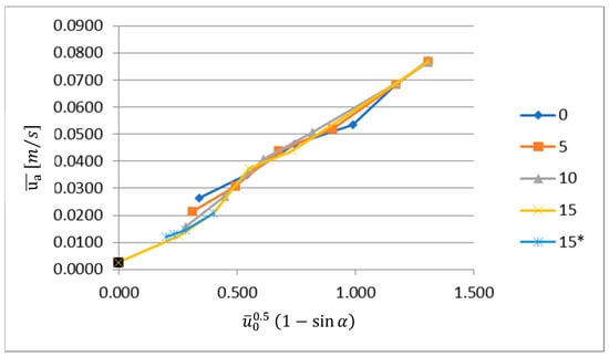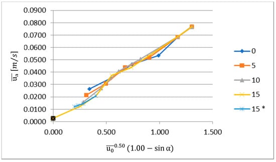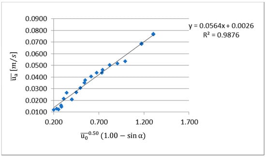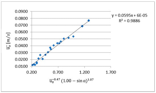 When coordinates and are used to express the test results (Figure 9), it is possible to see that the test results almost collapse into a straight line. It should be noted that it was found that the angle does not influence the average velocity at the opening for the Reynolds numbers of Re = 1710 and above, and therefore, it was deemed irrelevant to include the term sin α in its expression (Equation (20)). Figure 10 shows the best fit for the test results when the coordinates referred to above are considered. The correlation coefficient obtained corresponded to 0.9883. Figure 9 also includes the test results obtained in the study about the effect of the variation on the jet thickness (see Table 3), designated in the figure key as 15*; it is clear that these results are fully aligned with further test results obtained for the same jet angle.