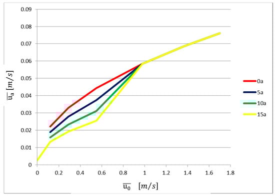 We stress that the empirical Function (23) does not show the same dependence on jet velocity and on jet angle as the theoretical simplified Function (14). Figure 16 presents Equation (14), together with the experimental results (the horizontal coordinate in this figure is different from the one adopted in the previous figures). It is clear that Equation (14) is close to the experimental results just for the jet angle of 15° and for Re < 1224. For the jet angles lower than 15°, the corresponding average jet nozzle velocity is higher than the predicted by Equation (14). For higher Reynolds numbers, Equation (14) predicts an average velocity of the flow across the door higher than the one measured in the experiments. This shows that some physical processes, which are relevant for the transport of the contaminant, are not expressed in the theoretically derived equation. We consider that such processes are related to the turbulent behaviour of the jet at the floor impingement zone.