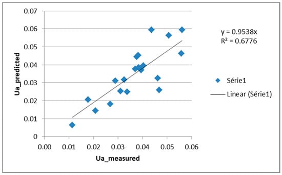 As Figure 11 shows, a good adjustment of the experimental values has been achieved. This has led to obtaining a correlation coefficient of 0.9886 (Figure 12), which is quite close to the previous relation. These results are considered in Equation (22).