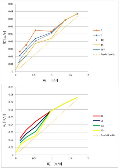 The graph in Figure 15 depicts the experimental results (; ), which were compared with the corresponding values obtained by Equation (23). It is possible to observe that Equation (23) is a fair approximation of the experimental results. It is also clear that the results for the Reynolds number Re = 1224 (corresponding to U0 = 0.98 m/s) are still in a transition between the low Reynolds number results, in which the jet angle is relevant, and the higher Reynolds number results, in which the jet angle is not relevant.