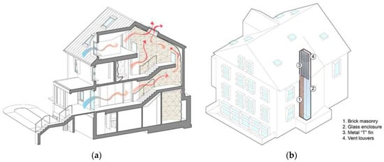 Figure 1a) that channels airflow from the ground level entry to the upper roof skylight windows. Similarly, a solar chimney (