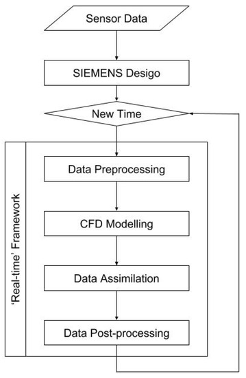 Figure 4. In this research, the real-time CFD modeling framework is carried out by Python and Ansys Fluent. Python performs the data processing and automation processes while Ansys Fluent carries out the calculations on flow and heat transfer. The calculations are run on a DELL PRECISION Tower 7810 (Dell, Nashua, NH, USA) workstation with 40 processor cores. First, sensor data is collected into the SIEMENS Desigo system and then sent to the data pre-processing module. The data is sampled every 20 min and averaged over 20 min [