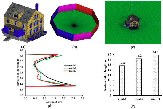 Figure 3c) is joined by transforming the tetrahedral cells adjacent to the interface into pyramid cells. The whole domain is discretized into 1.07 million cells based on a grid independence study using 0.65, 1.07, and 1.81 million cells. The grid independence for subdomain is assessed by comparison of air velocity profiles at different positions inside the house.