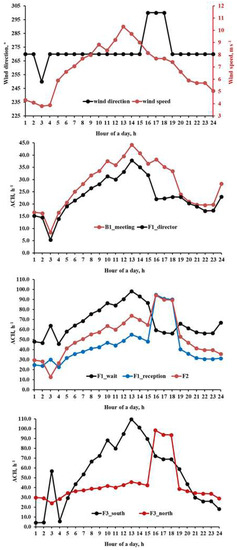 Figure 5c). The high ventilation rates occur at 4:00 p.m. when the wind direction favors the natural ventilation through the windows on the northern facade, although the wind speed is lower than that at 1:00 p.m. This indicates the significant impact of wind directions on natural ventilation rates. The normalized ventilation rate (