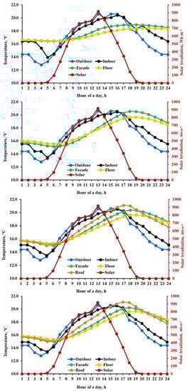 Figure 6 shows the variation of indoor air temperature for 24 h. In general, the indoor air temperature is higher during the night and lower in the day compared to the outdoor air temperature. The reason is that thermal mass on the facades and floors absorbs solar heat flux during the day and releases it during the night, which is clearly shown by the temperature variations in the facade, floor, and roof. By absorbing solar heat during the day, the indoor temperature can be maintained to be cooler than the outdoor air. On the other hand, the indoor air temperature is warmed up by the heat rejected from the thermal mass at night.
