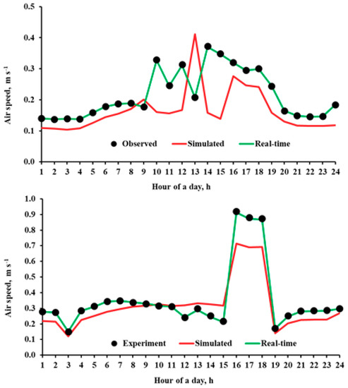 Figure 7 shows the comparison of observed, simulated and real-time air speeds at two such positions during a 24 h time period. Without data assimilation, the simulated air speeds are either overestimated or underestimated compared to the observed values. By using data assimilation, the simulated air speeds during all hours at all data sensor locations are nudged closely toward the observed values. The nudging method guarantees the implementation of self-calibration of real-time CFD during the running process.