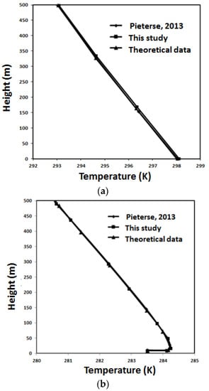 Atmosphere boundary layer has different thermal stabilities due to the change of air temperature deviations. The different thermal stabilities have impacts on pollutant dispersion due to buoyancy effects. Figure 4 shows comparisons of the inlet temperature vertical distributions against theoretical data and simulation results introduced in [16] by Pieterse et al.