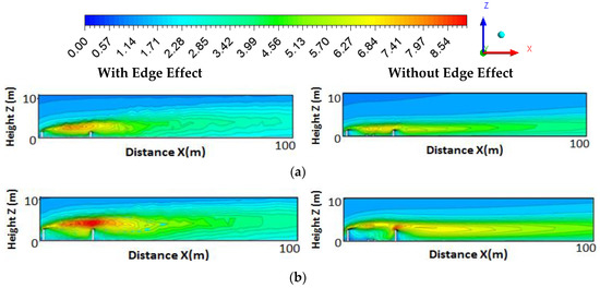 Figure 11 shows the contour of pollutant dispersion in a symmetry plane (Y = 90 m). It can be seen that the noise barrier can reduce the pollutant concentration of the downwind region. A difference in downwind concentration can also be seen for with and without edge effect cases. Higher pollutant concentrations can be found in downwind locations for cases with side edge effect. In the area between barriers, side edge cases have lower pollutant concentrations than non-side edge cases. In Figure 8, higher turbulence intensity between barriers and lower turbulence intensity downwind can be found for side edge effect cases at the symmetry plane (Y = 90 m). Wind speed and turbulence intensity determine turbulent mixing and flow intensity. Those flow features will directly affect pollutant dispersion. Higher turbulence intensity and wind speed help pollutant dispersion faster.