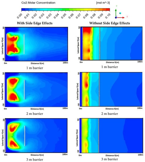 Further downwind at location X = 100 m, with a different barrier height, the concentration profiles are shown in Figure 14. For edge effect cases, all the concentration profiles at different barrier heights follow a similar shape as a Gaussian distribution. A peak concentration can be found for all barrier heights at the symmetry plane. The peak concentration value decreases as the barrier height increases. The 1 m barrier case has a maximum peak concentration of about 0.014 mol/m3, and the 4 m barrier case has a minimum peak concentration of about 0.009 mol/m3. Figure 14b shows concentration profiles with different barrier heights for without edge effect cases. An almost uniform distribution of concentration can be observed.