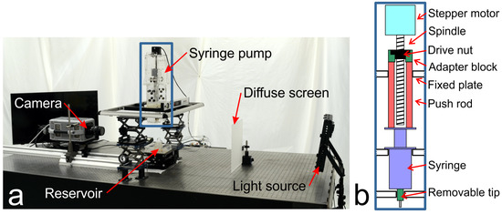 The syringe plunger is actuated by a NEMA 23 stepper motor with a threaded spindle. A push rod is securely fastened to the drive nut on the threaded spindle with an aluminum adapter block. To translate the rotary motion of the motor into a linear motion, the push rod is held irrotationally by two fixed acrylic plates with appropriately sized square cutouts. Figure 2b shows a diagram of the syringe apparatus.
