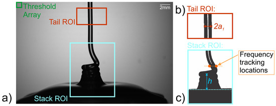 MATLAB was used to process high-speed test image files. Regions of interest (ROIs) were selected by the user on the initial image to designate the tail and stack regions of the coil as shown in Figure 3. The image portions in the tail and stack ROIs were then binarized using a threshold of the average pixel intensity within the threshold ROI. The threshold ROI is the 10 × 10 array of pixel in the upper left-hand portion of an image. The resulting binarized ROIs are used for measurements where the background and coil are pure white and black, respectively.