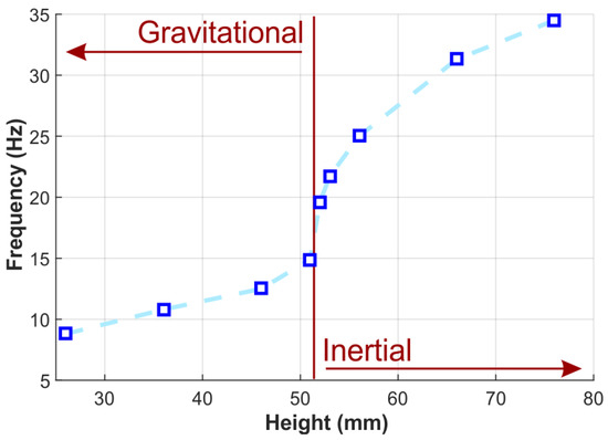 Frequency versus height for a series of steady flow rate tests of honey at 0.18 mL·s−1. Individual trials are denoted by blue squares. The dashed blue line represents linear interpolation between trials. The transition from gravitational to inertial flow between trials at 51 and 52 mm is annotated.