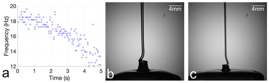 Coiling frequency as a result of transient flow rate using honey. The flow rate was decelerated from an initial, steady flow rate of 0.7 mL·s−1 to 0.15 mL·s−1 over 3 s at a fall height of 6 cm. (a) The coiling frequency dropped continuously with decreasing flow rate. Images of the coil (b) before and (c) after deceleration show the changes in the coil.