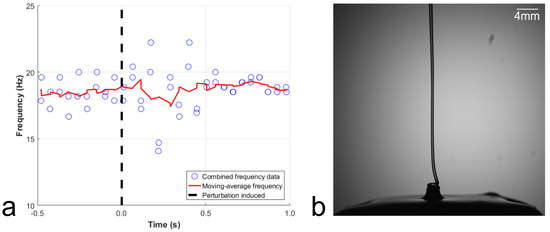 Steady coiling, using honey, around the inertial-gravitational regime induced with a perturbation.The flow rate was 0.85 mL·s−1 from a fall height of 7 cm. (a) Coiling frequency oscillates in an unsteady manner for a brief period before returning to steady coiling once the perturbation has passed. (b) Image of the perturbation propagating along the coil can be observed in the slight bending of the falling liquid.