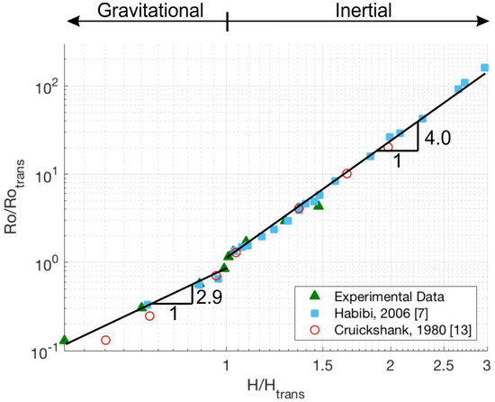 The Pi groups created in Equations (1) and (2) correspond to the Roshko () number and non-dimensional height (H), respectively. The third and fourth Pi groups can be deduced from other non-dimensionalizations [8,13]. With these two parameters, a comparison can be made between different datasets of frequency versus height. The data generated in the present work is compared to previously published work by Habibi [7] and Cruickshank [16]. The magnitude of the Roshko number and non-dimensional height varies significantly between the datasets, which is attributed to different values of and . The groups and are not consistent between datasets, and are not further examined here. Similarity between the datasets is shown by presenting Ro and H as ratios to their respective transition values ( and ) when the coiling changes from gravitational to inertial. This normalization to transition values allows the three datasets to be on the same order of magnitude which allows for comparison between the trends seen in inertial and gravitational flow. The regime transition is precisely known in the experimental data collected, as reported in Figure 7 here and by Habibi [7]. Experimental data presented by Habibi annotated where the regime transition occurred and were used to calculate regime transition values. Flow regimes were not named in the work by Cruickshank [16], as regimes were not yet individually identified, but the slope change on logarithmic axes is clear in the dataset. A regime change in the experimental data presented by Cruickshank can be inferred by assuming the transition between individual data points. The transitional values for and from the Cruickshank data were approximated by iteratively assuming a regime transition between each of the reported data points and choosing the iteration that showed a close match to the other two datasets. Experimentally determined and inferred values for a transitional Roshko number and a non-dimensional height are presented in Table 1. In this scaling, dividing by the transitional value only translates the data and does not affect the slope.