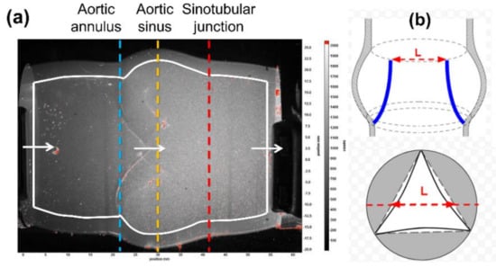 Example raw image of the aortic root demonstrating (a) three major sites (aortic annulus, sinus, and sinotubular junction) for deformation analysis and (b) the effective length of the orifice (L).