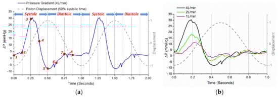 Pressure gradient waveforms (a) the pressure gradient in two cardiac cycles and the particle image velocimetry (PIV) measurement phases; (b) the pressure gradients under different reduced cardiac outputs.