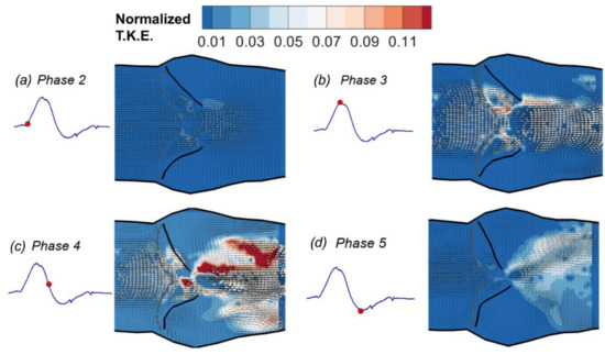 where and are the velocity fluctuation components in the horizontal and vertical directions, respectively, and is the peak centerline flow velocity, which is used for normalization for all of the phases. Figure 7 shows the TKE distributions at a few selected phases. It is clear that the turbulence was minimal at the beginning of the phases during the acceleration phase of the systole (Figure 7a,b). Particularly at phase 3 when the peak systolic velocity developed, the TKE was very low, and moderate TKE areas were only found near the interface of the jet flow downstream due to the fluid shear. However, at phase 4 (Figure 7c), right after the peak systole, the TKE downstream from the aortic valve increased dramatically as the valve started to close and the flow decelerated. At phase 5, when the negative pressure gradient built up, the overall magnitude of TKE was reduced. The flow energy dissipation caused a fan-shaped TKE distribution downstream from the narrowing orifice (Figure 7d). In the following phases, the TKE in the entire flow field quickly decreases to near-zero values (not shown for brevity) until the next systolic jet flow develops. The entire process demonstrates that the instability of the pulsatile flow past the aortic valve bursts into turbulence during the initial deceleration phases and quickly dissipates (a quarter of a second in this study) during the diastole phases before the next cycle starts.