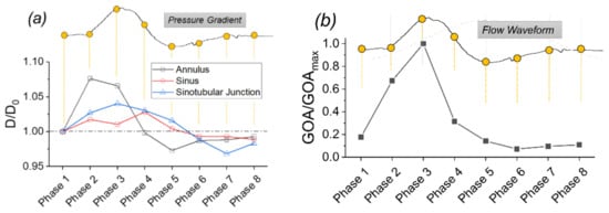 The deformation of the compliant model under the pulsatile flow was quantified by the variations of the tubular diameters and the leaflet orifice areas as shown in Figure 8. Figure 8a displays the changes of the normalized diameters (D/D0, D0 is the initial diameter at phase 1) during the cardiac cycle at the aortic annulus, aortic sinus, and sinotubular junction, respectively. The results show that the aortic annulus experiences the largest radial deformation during the course of the systole due to the direct exposure to the high upstream left ventricular pressure. In addition, it is interesting to note that while the maximum deformation of the aortic annulus and the sinotubular junction happened at phase 3 when the maximum jet flow occurs, the maximum deformation of the aortic annulus occurred at an earlier phase ahead of the peak systole. This early area increase of the aortic annulus (base) was also found in previous clinical studies of aortic root dynamics [47]. Figure 8b shows the dynamic motion of the leaflet in terms of the changes of GOA, which was normalized by its maximum value in a cycle. It is clear that a significant increase of the orifice area also started to occur at an earlier phase before the peak systole. The opening area of the leaflets then increased as the systolic jet developed and decreased quickly past the peak systolic phase. It should be noted that the GOA is not completely zero during diastole due to the small gaps between the silicone leaflets and the limitation of the molding manufacturing process.