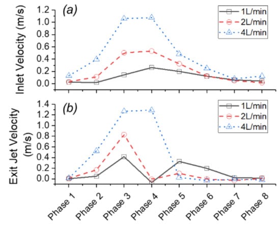 The inlet (a) and exit (b) jet centerline velocities at different phases under three cardiac outputs.
